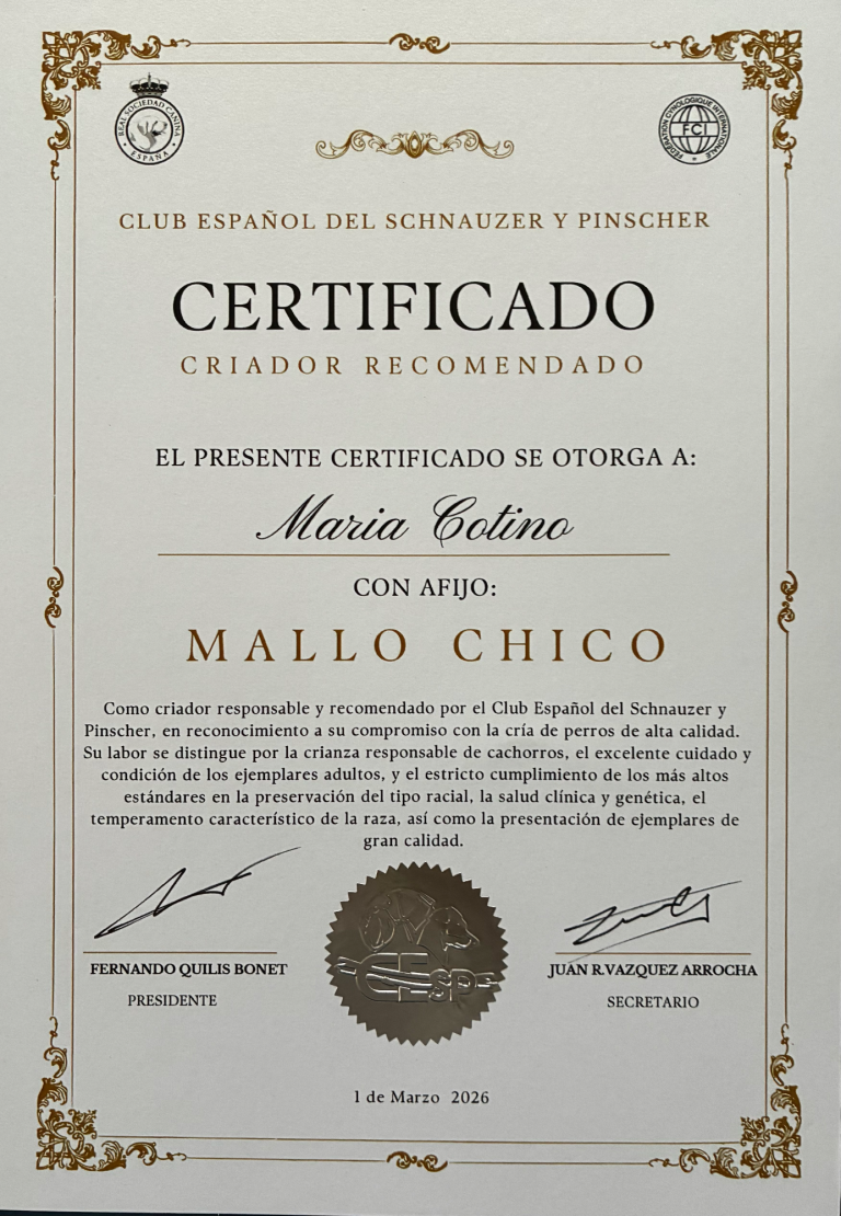 Ya muy pequeña me fascinaban los perros, me comunicaba con ellos, sobre todo las razas grandes, me crié junto a un Pastor Alemán gris fuerte y duro de aquella época que era de mis abuelos y él ya me marcó para siempre. Desde bien pequeña compraba revistas de perros y soñaba con ser "criadora". En un momento de mi vida se juntaron los astros para poder comenzar esta andadura con el afijo Mallo Chico en el que he estado trabajando mas de 15 años.